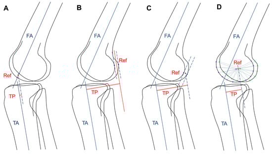 Four measurement methods. The femoral axis (FA) and the tibial axis (TA) were drawn first. (A) In method 1, the midpoint of the intersection points of the femoral axis and the femoral condylar edges was the femoral reference point (Ref). (B) In method 2, the midline of the lines tangential to posterior femoral condylar edges and parallel to TA was the femoral reference line (Ref). (C) In method 3, the midpoint of the tangent points of the lines tangential to posterior femoral condylar edges and parallel to FA was the femoral reference point (Ref). (D) In method 4, the midpoint of the center points of the medial and lateral femoral condyle landmarks was the femoral reference point (Ref). Finally, in all four methods, the distance between the TA and Reference was the tibial position (TP).