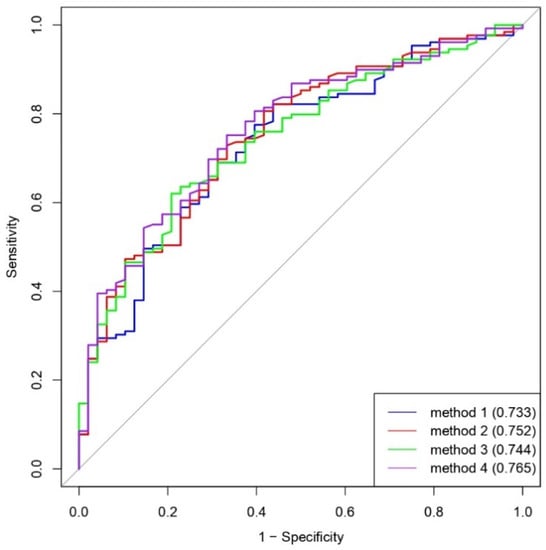 The ROC curves showing the diagnostic abilities of all four measurement methods were illustrated in Figure 5. The AUCs of methods 1 to 4 were 0.733, 0.752, 0.744, and 0.765, respectively. The optimal thresholds and cutoff points (maximum Youden’s J statistic) of methods 1 to 4 were 6.16 mm, 7.47 mm, 6.41 mm, and 3.97 mm, respectively. Based on these optimal thresholds, the diagnostic performances of all four measurement methods were shown in Table 2. The accuracies of the four methods were 75.1%, 71.2%, 66.7%, and 72.9%, respectively.