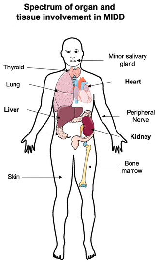 Schematic representation of extra-renal involvement in MIDD (monoclonal immunoglobulin deposition disease). Adapted from Joly, Cohen et al. [21] Randall-type monoclonal immunoglobulin deposition disease: novel insights from a nationwide cohort study. Blood.
