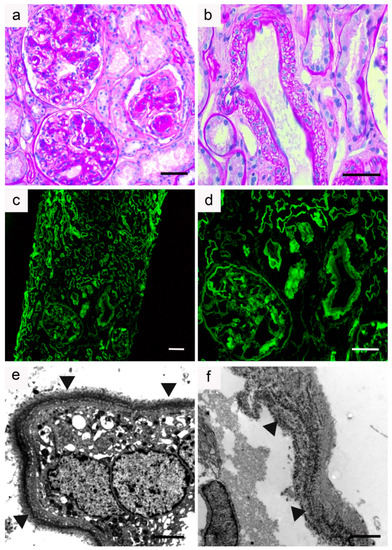 Kidney biopsy sample from a patient with κ-light chain deposition disease: (a,b) Light microscopy, periodic acid-Schiff staining (PAS); (a) Section of renal cortex showing nodular glomerulosclerosis with nodular mesangial deposits and aneurysmal dilatation of the capillary lumens (×200); (b) Note the presence of PAS-positive deposits along vascular myocytes and tubular basement membranes (×400). Bar = 50 µm; (c,d) Immunofluorescence microscopy (anti-κ conjugate). Glomerular deposits and linear deposits along tubular basement membranes and vascular myocytes (c: ×100 and d: ×200). Bar = 50 µm; (e,f) Electron microscopy. (e) Enlarged tubular basement membrane with electron-dense powdery punctuate deposits (arrows) predominating in the outer aspect (×15,000). Bar = 2 µm; (f) Linear electron-dense deposits (arrows) predominating along the endothelial inner aspect of the glomerular basement membrane (×12,000). Bar = 2 µm.
