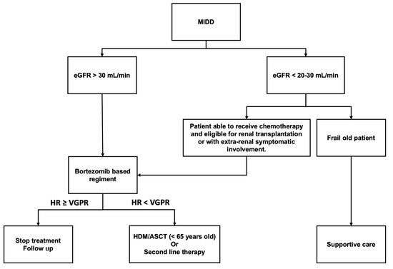 The place of HDM/ASCT in therapeutic strategy is still to be clarified. In the different studies published to date, HDM/ASCT induced high rate of hematologic and renal responses. Nevertheless, whether HDM/ASCT is superior to bortezomib-based regimen is unclear. Indeed, MIDD patients who received HDM/ASCT were younger, with better renal function, making it difficult to compare between these two strategies [21,26,47].