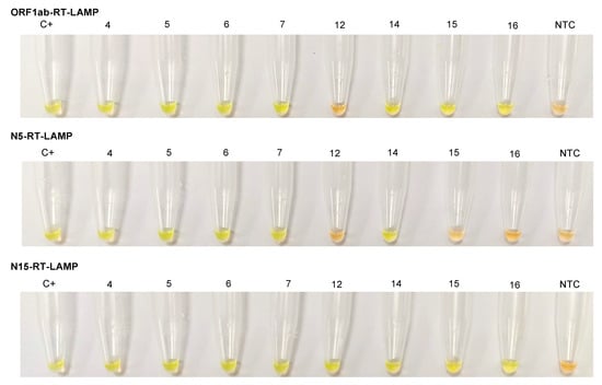 - Jiang, M.; Pan, W.; Arasthfer, A.; Fang, W.; Ling, L.; Fang, H.; Daneshnia, F.; Yu, J.; Liao, W.; Pei, H.; et al. Development and validation of a rapid, single-step reverse transcriptase loop-mediated isothermal amplification (RT-LAMP) System potentially to be used for reliable and high-throughput screening of COVID-19. Front. Cell. Infect. Microbiol. 2020, 10, 331. [Google Scholar] [CrossRef]