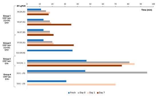 | Group 1 ORF1ab+ (Ct < 30) E/N+ | 1 | VIASURE | 22 | 27 | 15 | 14 | 9 | 27 |