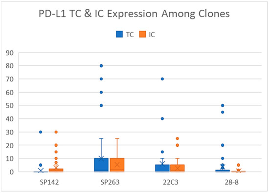 TC and IC scores of the four PD-L1 clones. Overall, SP263 had the highest expression of TCs and ICs. SP142 had negligible TC expression, and 28-8 had extremely low IC expression.
