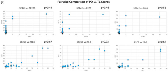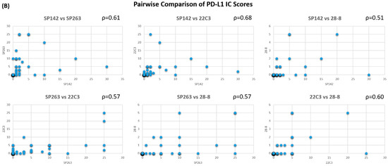 For TC scores, SP142 had only fair correlations with SP263, 22C3, and 28-8 (rho = 0.44, 0.46, and 0.51, respectively), whereas SP263, 22C3, and 28-8 had moderate correlations with each other. Compared to that for the TC scores, the pairwise comparison of IC scores by clones revealed a similar strength of correlation. All the Spearman’s correlation coefficients ranged from 0.51 to 0.68, indicating fair to moderate correlations between any two clones. Figure 2 illustrates the pairwise comparison of PD-L1 TC and IC expression by clones.