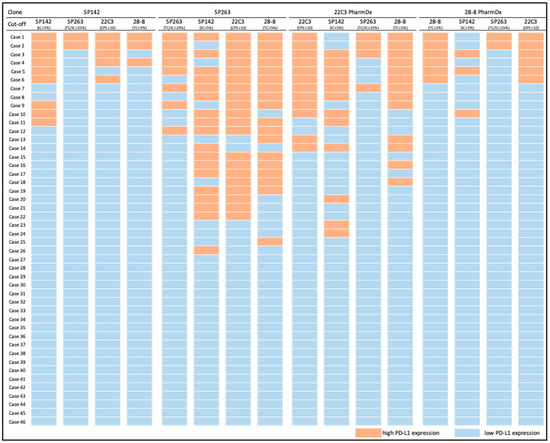 Next, four FDA-approved PD-L1 clones were applied in IHC staining: Ventana SP142 and Ventana SP263 (Ventana Medical Systems, Tucson, AZ, USA), and 22c3 pharmDx and 28-8 pharmDx (Dako Agilent Technologies, Santa Clara, CA, USA). The PD-L1 staining was processed on two platforms—the Benchmark Ultra System (SP142 and SP263) and Autostainer Link 48 (22C3 and 28-8)—as per the manufacturers’ instructions.