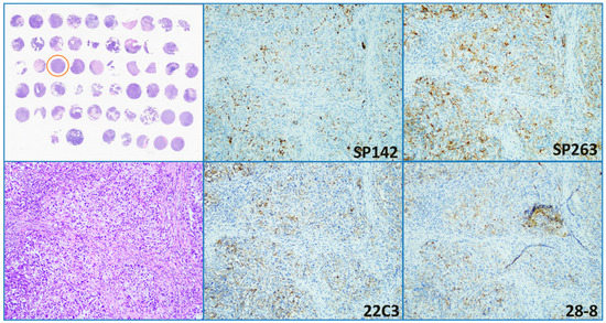 High PD-L1 expression demonstrated by the four clones in a case (marked by a circle on the TMA map).
