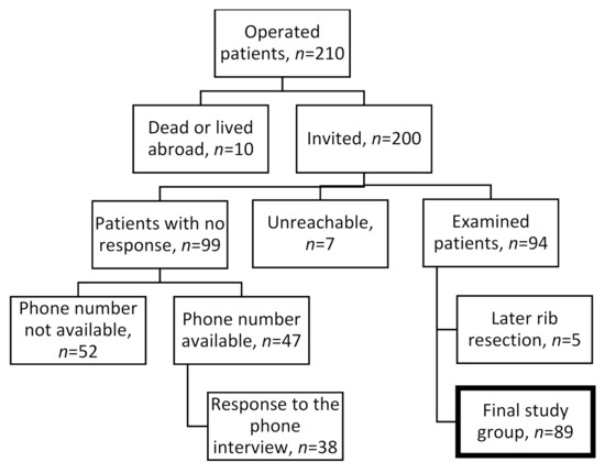 Of those non-responding, 47 (47.5%) could be contacted by phone; 16 had been too busy to take part in the research, 20 had unrelated disease hindering their participation, and others had reasons like too lengthy a trip to follow-up. Of those 47 interviewed, 59% judged their long-term result as being excellent or good. Five female patients were failures due to a later rib resection. Their outcome results after rib resection were similar to outcomes of others (Table 5).