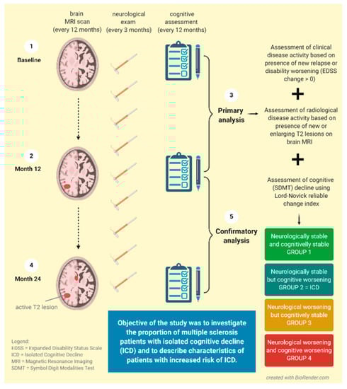 The following Supplementary Materials are available online at https://www.mdpi.com/2075-4418/11/3/464/s1, Figure S1: Selected between-group differences in baseline radiological, neurological and neuropsychological scores: Example of group differences disappearance in sample of patients with normal cognition at baseline (SDMT Baseline ≥ −1.5 SD) and its accentuation in people with impaired cognition at baseline (SDMT Baseline < −1.5 SD); Figure S2: [Confirmatory Analysis, Month 12–24] Neuropsychological and Neurological Evaluation Between Month 12 and Month 24; Figure S3: [Confirmatory Analysis, Month 12–24] Between-group differences in baseline radiological, neurological and neuropsychological scores showed on probability density plots: Example of the similar trend of worse baseline disease markers in the both cognitively worsening groups (red), in a contrast to the both cognitively stable groups (grey); Table S1: Binary logistic regression results, GROUP 1 and GROUP 2 membership as a dependent variable (Baseline—Month 12); Table S2: [Confirmatory Analysis, Month 12–24] Binary logistic regression results, GROUP 1 and GROUP 2 membership as a dependent variable (Month 12–24); Table S3: Change of basic sample characteristics over 12 months (Baseline—Month 12); Table S4: [Confirmatory Analysis, Month 12–24] Basic sample characteristics at Month 12; Table S5: [Confirmatory Analysis, Month 12–24] Change of basic sample characteristics over 12 months (Month 12–24); Table S6: [Confirmatory Analysis, Month 12–24] Post-Hoc pairwise comparison of selected subgroups at Month 12.