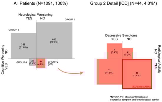 Out of Group 2 (ICD), 26 patients (59.1% of Group 2 (81.3% if cases with missing MRI data are excluded); 2.4% of all patients) showed concurrent radiological disease activity while cognitively worsening. Over half of the Group 2 patients were depressed (n = 24, 54.5%) and most of them had stable or improving depressive course over the follow-up (n = 43, 97.7%). Overall, 34.1% (n = 15) (46.9% if cases with missing MRI data are excluded) of individuals from Group 2 met the strict ICD criteria (concurrent MRI disease activity and no depressive symptomatology) indicating that 1.4% of our total sample experienced confirmed ICD in SDMT over the one-year follow-up when the strict criteria were applied (Figure 2).