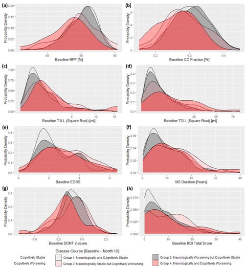 Between-group differences in baseline radiological (a–d), neurological (e,f), and neuropsychological (g,h) scores showed on probability density plots: example of the similar trend of worse baseline disease markers in both cognitively worsening groups (red), in a contrast to both cognitively stable groups (grey). (Legend: BPF = Brain parenchymal fraction, CC = Corpus callosum, T1LL = T1 Lesion Load, T2LL = T2 Lesion Load, EDSS = Expanded Disability Status Scale, SDMT = Symbol Digit Modalities Test, BDI = Beck Depression Inventory.)