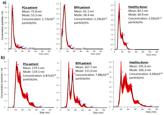 EVs were successfully isolated from all serum and urinary supernatant samples. In agreement with recent literature [17,18,19], NTA analysis revealed a concentration of serum EVs in the range of ~1012 particle/mL, and of urinary EVs in the range of ~1010 particle/mL; the latter being slightly higher in size and endowed with wider heterogeneous size distribution than serum EVs (Figure 1). No statistical differences were found between the EV concentration among the three groups (serum EVs: p = 0.2851; urinary supernatant EVs: p = 0.3405).