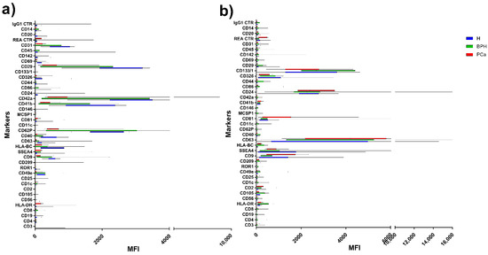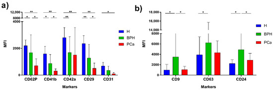 Flow cytometric analysis of EVs was then performed by the MACSPlex kit. The MFI of each marker is reported in Figure 3 and in Supplementary Tables S2 and S3. In keeping with previous literature [17,18,19], marker expression profile of serum and urinary supernatant EVs were markedly different. In particular, high expression of CD24 and CD133 was detected in urine EVs, the two markers being nearly absent in serum EVs [17]. MACSPlex analysis of serum EV in the three groups showed differences in the expression of five markers, namely CD62P, CD41b, CD42a, CD29, and CD31 (Figure 4). In particular, the expression levels of CD62P, CD41b, and CD29 were significantly different in PCa compared to BPH and H groups; CD42a expression level was higher in PCa and BPH vs. H; and CD31 was significantly different between PCa and H (Table 1). Regarding the urinary supernatant EVs, the MACSPlex results highlighted three significant markers (CD9, CD63, CD24) (Figure 4). In particular, CD9 and CD24 were different between BPH vs. PCa and H; whereas CD63 was significantly different between H and BPH (Table 2).