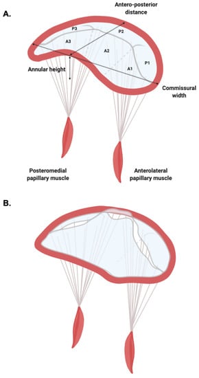 The classical work of Lam and colleagues defined the anatomy of the sub-valvular apparatus. They found that chordae tendineae arise from the tips of the papillary muscles (anterolateral and posteromedial) and depending on the site of insertion can be classified as primary (those that attach to the distal, free edge of the rough zone), secondary (those that ventricular surface of the body of the leaflet) and tertiary (those exclusive to the posterior leaflet, attaching to the ventricular wall) []. The posteromedial papillary muscle gives rise to chords attaching to the medial half of both leaflets (i.e., posteromedial commissure, P3, A3, and medial portions of P2 and A2), while the anterolateral papillary muscle gives rise to chords inserting into the lateral portion of the leaflets (i.e., anterolateral commissure, A1, P1, and lateral segments of P2 and A2) [] (Figure 1).