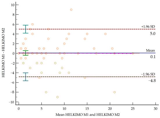 Results showed a maximum weighted kappa value of 0.774 for item C and a minimum value of 0.426 for item A2. Based on these values, reliability ranged from moderate to substantial, while the total score of the scale reached an excellent degree of concordance of 0.905 (Table 2). Figure 1 shows the Bland–Altman plot. Table 3 shows concurrent validity of the Helkimo Clinical Dysfunction Index with other specific and generic instruments.