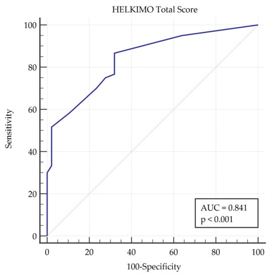The ability of the HCDI to discriminate between TMD patients and healthy subjects was determined using receiver operating characteristic (ROC) curves. First, the classification of the subjects as TMD patients or healthy controls was carried out based on the diagnostic criteria of the DC/TMD protocol, and the total score obtained in the HCDI was evaluated as a variable. In the ROC curve, the fraction of true positives (sensitivity) was represented as a function of the fraction of false positives for different cut-off points. The area under the curve (AUC) was also calculated as a measure of the ability of the score to discriminate between the two diagnostic groups (TMD patients or healthy subjects). The AUC was considered statistically significant when the 95% confidence interval did not include 0.5 [44]. Values between 0.5 and 0.7 indicated low accuracy, values between 0.7 and 0.9 indicated good accuracy and values greater than 0.9 indicated high accuracy [45].