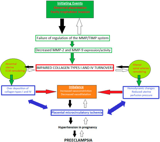 A widely held concept is that initial faulty trophoblast invasion and abnormal placentation are considered to be initiating events [39]. Thus, the degradation activity of gelatinases MMP-2, and -9 is disturbed. Decreased MMP-2 and -9 expression/activity could lead to impaired collagen types I and IV turnover, which might affect the remodeling of uterine ECM and spiral arteries [56,57]. Various cytoactive factors are released triggering an incessant cycle of over deposition of collagen, suppressed trophoblast invasion of spiral arteries, angiogenic imbalance (presented by increased vasoconstriction and reduced vasodilation), generalized RUPP, and disturbed blood flow to both the placenta and fetus. All these processes might be reason for uteroplacental ischemia. Therefore, a vicious cycle is activated and suppressed trophoblast invasion of spiral arteries and RUPP deteriorate. Placental ischemia progresses, causing hypertension in pregnancy, preeclampsia, and intrauterine growth restriction; however, the molecular mechanisms and the abnormal regulation of MMP-2 and -9 expression/activity contributing to the genesis and progression of hypertensive disorders of pregnancy are unclear [39,56,58,59] (Figure 1).