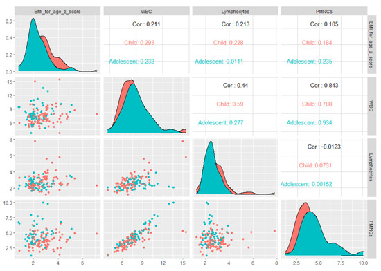 When we explored the association between WBC and BMI-for-age z-scores stratified by age groups (Figure 1), we found a significant positive correlation in children (Spearman’s Rho coefficient ρ = 0.293, p = 0.006), while for adolescents a positive correlation was found with a tendency toward significance (Spearman’s Rho coefficient ρ = 0.23, p = 0.081).
