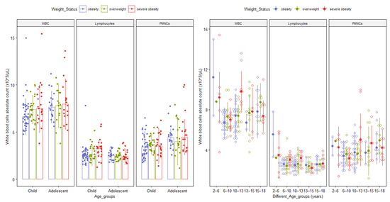 Contrarily, the polymorphonuclear neutrophils count changes later in life in both severely obese pediatric patients and patients with a lower degree of obesity (see Table 2). Similar variations of differential white blood cell count in normal-weight healthy pediatric patients have been acknowledged in other studies and reference values have already been proposed (i.e., in early childhood polymorphonuclear neutrophils count is the lowest and lymphocyte count is the highest and they change in an opposite direction with time) [54,55,56,57].