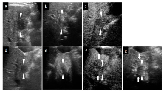 Grayscale ultrasound (US), contrast-enhanced US with Sonazoid (SCEUS), and contrast-enhanced MRI (CEMRI) images before and seven months after radiotherapy (RT) for a HCC lesion (maximum diameter: 22 mm) in segment IV, evaluated as no local recurrence after RT. A safe punctuation was difficult, as the lesion was located behind the gallbladder. The patient refused surgical resection, so they received RT. SCEUS before RT (a–c): A hypoechoic lesion was observed using grayscale US (a). This lesion showed hypervascularity during the arterial phase (AP) of SCEUS (b) and hypoechoic (perfusion defect) during the post vascular phase (PVP) (c). SCEUS seven months after RT (d–g): Grayscale US showed a hypoechoic nodule and a reduction in tumor size (d). AP SCEUS showed a disappearance of vascularity of the HCC lesion and hypervascularity of the surrounding liver parenchyma (e). Both the HCC lesion and the surrounding liver parenchyma appeared as a perfusion defect during the PVP (f). After re-injection of Sonazoid during the PVP, the HCC showed hypovascularity and the surrounding liver parenchyma showed hypervascularity (g). AP CEMRI before (h) and seven months (i) after RT: Before RT, this lesion showed hyperintensity during AP CEMRI (h). Both the HCC lesion and the surrounding liver parenchyma appeared as hyperintensity at seven months after RT (i). Seven months after RT, we observed a discrepancy between the vascularity shown by SCEUS and that by CEMRI, but the lesion has not recurred for more than 3 years, suggesting that the SCEUS findings might be correct. Arrowheads show the margins of the HCC lesion. Arrows show the margins of irradiated surrounding liver parenchyma.