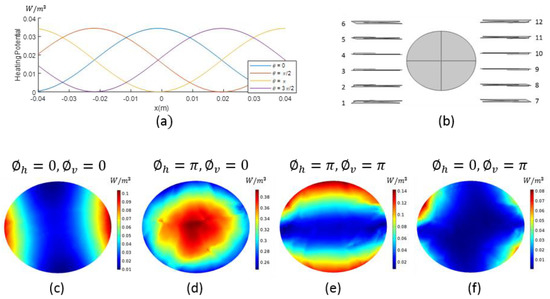 Starting with the same phase and the amplitude for the antennas, we changed the phase of the sub-array-1 to denoting the horizontal phase difference. Figure 1c–f illustrate the HP of the z = 0 slice of the 3-dimensional homogenous fat phantom simulation. Figure 1c,d display the HP where is 0 and , respectively. With this phase change, we were able to move the focus from horizontal sides to the center of the homogeneous phantom; can be used to selectively focus on the horizontal axis. Adding vertical phase difference to sub-array-2, we obtained the following phase values for the antennas:;;;. Figure 1d,e display the HP where is 0 and , respectively, and the focus is shifted from the center to the vertical edges, providing the opportunity for selective focusing on the vertical axis. The HP in Figure 1f is focused in a diagonal fashion. From the presented analysis, we can conclude that it is possible to move the focus of HP as desired by just appropriately changing phase values.