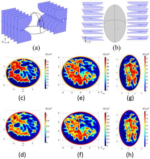 Due to the asymmetric and complicated shape of the breasts, COMSOL Multiphysics failed to converge during the simulations. Therefore, simpler shapes were formed inside the program using its geometry interface. An ellipsoid with 4.5 × 3.85 × 7.25 cm semi-axis dimensions fitted well to the shape of breast model-I (Figure 3a), and an ellipsoid with 3.4 × 5.8 × 7.25 cm semi-axis dimensions was used for breast model-II (Figure 3b). A skin layer of 0.15 cm was added to the ellipsoid, consistent with the original data. Dielectric properties of the skin were also calculated from the Debye parameters. The ellipsoid was cut such that the height of the breast remained as 6.75 cm. Although the shapes of the breasts were not original, we mapped the dielectric values formed from the corresponding Debye parameters to the simpler breast phantoms. There were no cancerous tissues in the repository; therefore, a sphere with a 0.3 cm radius was formed as the tumor tissue. Dielectric properties of the breasts at 915 MHz at z = −2 cm and z = 0 cm slices are given in Figure 3c–h. Relative permittivity of the tumor was kept constant, units, throughout this study, but the conductivity of the tumor was changed.