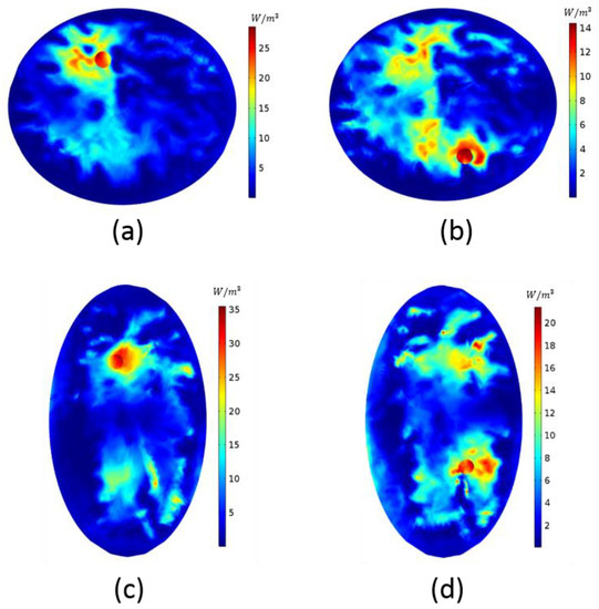 Heating potential of (a,b) breast model-I with different tumor locations; (c,d) breast model-II with different tumor locations.