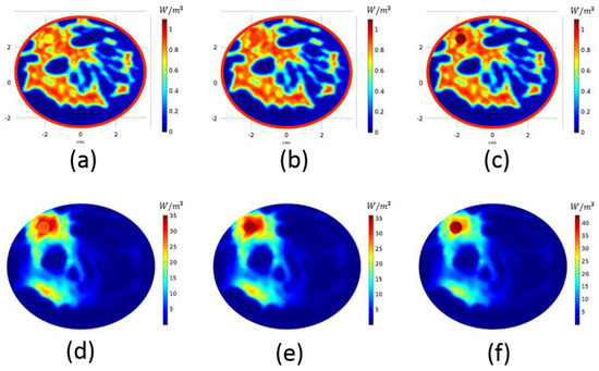 HP is directly proportional to the conductivity. We conducted a study with a z = 0 slice of breast model-I, the electrical conductivities of which are given in Figure 5a–c, to observe the effect of tumor conductivity on the focusing. Three different tumor conductivity values, 0.7 S/m, 0.9 S/m and 1.1 S/m, were used. Figure 5 gives the conductivity maps and the corresponding HP distributions, where the phase pair (Figure 2h) was used for focusing. When the tumor conductivity is higher, the HP is higher on the tumor and restricted to the tumor geometry; however, when the conductivity value is comparable to or a little lower than the surrounding tissue, the HP focus is no longer confined in the tumor but also to the neighboring tissue. Focus can be steered to a certain region via phase configuration, despite low conductivity values.