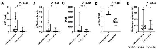 Markers of systemic inflammation and treatment response. (A) Box plots demonstrating significantly higher serum levels of C reactive protein levels (CRP) (p < 0.001), (B) CRP/albumin ratio (p = 0.01), (C) platelet × CRP multiplier (PCM) (p < 0.001), and (D) absolute neutrophile count (ANC) (p = 0.002) in non-responders. (E) Serum levels of alkaline phosphatase (ALP) (p = 0.045) were also associated with response, albeit less clearly.