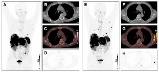 Treatment response to peptide receptor radionuclide therapy (PRRT) in a patient with low systemic inflammation at baseline. Maximum-intensity-projection (MIP) image (A) and transversal PET/CT images (B–D) of baseline [68Ga]Ga-DOTA-TATE PET/CT showing osseous, hepatic, and lymph node metastases in a 66-years-old male gastro-entero-pancreatic neuroendocrine tumor (GEP-NET) patient. MIP image (E) and transversal PET/CT images (F–H) at follow-up after two cycles of PRRT demonstrating decreasing tracer uptake or disappearance of lesions (SSR-TV decreased from 496 cm3 to 277 cm3, consistent with stable disease). The baseline CRP level was 1.6 mg/L, ANC was 4.0 × 109/L, the PCM was 227.2, and the HSPI was 0, evidencing low systemic inflammation.