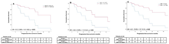 Cumulative survival curves for somatostatin receptor imaging-derived tumor volume (SSR TV) (A), white blood cell count (WBC) (B), and CRP (C) cut-offs estimated using a Cox proportional hazards regression model. High tumor volume, elevated white blood cell count, and elevated CRP levels were associated with significantly lower progression-free survival.