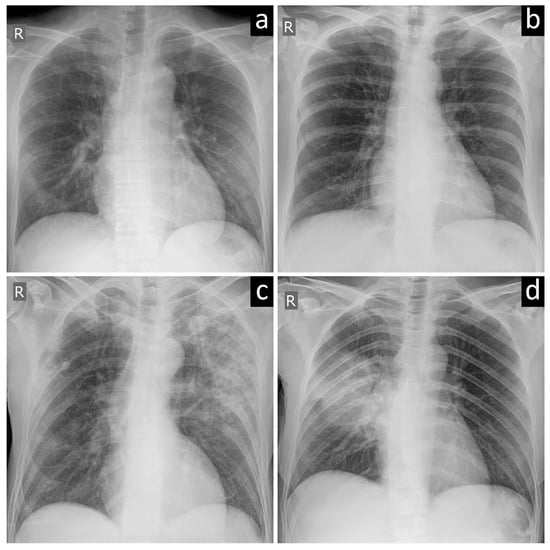 A total of 162 patients who underwent CXR and tested positive for SARS-CoV-2 infection at RT-PCR in Centers 1 and 2 from 21 February 2020 to 16 March 2020 were included in our retrospective evaluation (first group of patients). From all patients admitted to the two hospitals roughly in the same period the year before, 112 patients with CAP and 158 negative controls were included, accounting for a total of 270 patients in the second group. For the third group, 820 patients RT-PCR-confirmed COVID-19 patients were retrieved for our retrospective evaluation from the AIforCOVID database, 384/820 (47%) being categorized in the “mild” subgroup of this database, 436/820 (53%) in the “severe” subgroup. Table 1 shows the distribution of the 1252-included patients, while Figure 1 shows examples of CXRs with typical COVID-19 pneumonia (Figure 1a), negative findings (Figure 1b), and non-COVID-19 viral and bacterial pneumonia (Figure 1c,d).