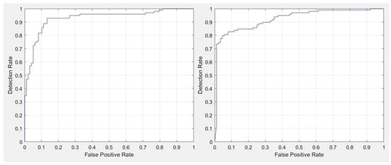(Left) areas under the curve at receiver operating characteristic analysis for COVID-19 versus negative and (Right) for COVID-19 versus community-acquired pneumonia in the cross-validation phase.