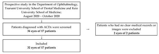 In this prospective study, 34 eyes of 17 individuals (12 males and 5 females) were screened. The mean age of patients was 21.5 ± 14.8 years. We screened the patients from August to October 2020. The patients who matched our inclusion criteria were recruited for the study. The inclusion criteria were as follows: (1) Japanese men and women (above 10 years of age), (2) patients who underwent slit-lamp examination with both the conventional slit-lamp microscope and SEC, and (3) no obvious ocular surface infections and/or inflammations. Patients who had at least one of the following were excluded: (1) ocular surgical intervention within 3 months prior to study and/or a history of refractive surgery within 6 months prior to study, (2) received any topical ophthalmic preparations, (3) unclear or lack of data, or (4) did not provide written informed consent. Sample size calculation yielded a required sample size of 17 eyes (details are provided in the Statistical and data analysis section). As a result, two eyes were excluded; we enrolled 32 eyes from 17 Japanese patients between August and October 2020 (Figure 1).