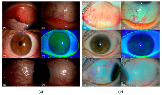 Representative images taken by the two devices; (a) the conventional slit-lamp microscope (700GL), and (b) the SEC. A 11-year-old female patient was diagnosed with SAC caused by orchard grass. (A,B) show the palpebral conjunctiva with dilatation of many vessels, localized edema, and a few papillae. There are no follicles or giant papillae. (C,D) show the limbus and the cornea without swelling, Trantas dot, or epithelial damage. (E,F) show the bulbar conjunctiva with dilatation of many vessels, and localized edema.
