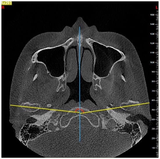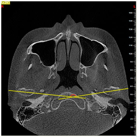 On the axial view, the slice of the condylar processes that had the widest mediolateral extent on both sides of TMJ was used to measure the angulation of the condyles, which involved two variables:
