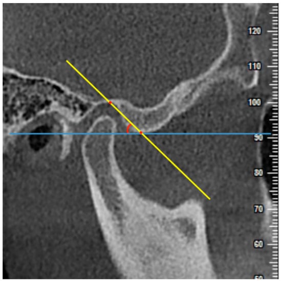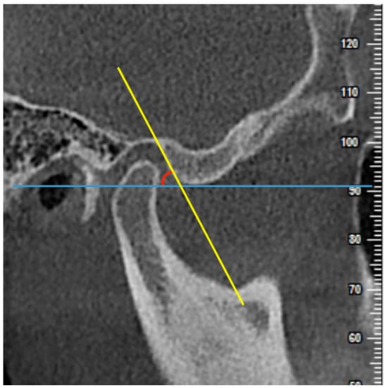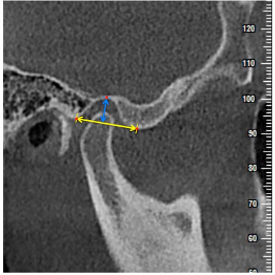 The chosen slice was also used as the reference view for the secondary reconstruction of the sagittal slices [], on which a line parallel to the long axis of the condylar process was drawn and sagittal images were reconstructed with a 0.5 mm slice interval and a 0.5 mm thickness. The following variables were calculated on the central sagittal slice of the TMJ: