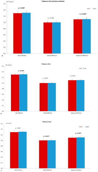 The thalamus of the girl group had significantly higher axial diffusion in the right (p = 0.048) compared to the left (Figure 2B) and the right THC pathway presented with significantly higher axial diffusion (p = 0.004), radial diffusion (p = 0.010) and ADC (p = 0.001) (Figure 3B). The FA of the left PT was significantly higher (p = 0.015) than the right. The CN and the GP did not reveal any significant asymmetry (Table 3).