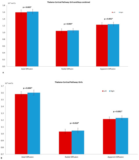 The asymmetry observed in the thalamo-cortical pathway with the axial diffusion (AD, p = 0.003); radial diffusion (RD, p = 0.003) and apparent diffusion coefficient (ADC, p = 0.001) of the combined group (A). On (B) the differences among girls AD (p = 0.004), RD (p = 0.010) and ADC (p = 0.001). The significance was set to p = 0.05 and highlighted with a star superscript (*).
