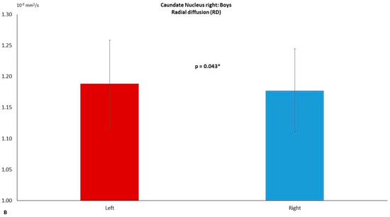 Significantly higher radial diffusion (p = 0.047) and ADC (p = 0.005) were recorded in the right compared to the left TH (Figure 2C) in the boys group (Table 4). The FA of the left PT was significantly higher (p = 0.044) than the right (Figure 5). The caudate nucleus showed significantly higher ADC in the right (p = 0.043) compared to the left (Figure 4B). The GP did not reveal any significant asymmetry.