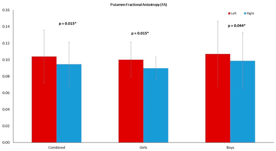 The putamen FA was higher in the left compared to the right in all groups: girls and boys combined (p = 0.015), girls (p = 0.015) and boys (p = 0.044). The significance was set to p = 0.05. and highlighted with a star superscript (*).
