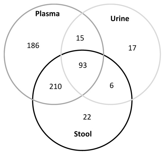 Venn diagram of metabolites measurable in plasma, feces, and urine.