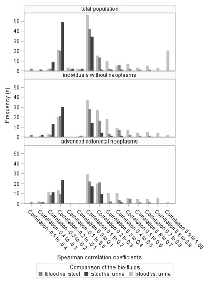 Moreover, we assessed the correlation of the metabolites between the different bio-fluids using Spearman rank correlation coefficients, both for the total study population as well as separately for the subgroups of participants with and without advanced neoplasms.