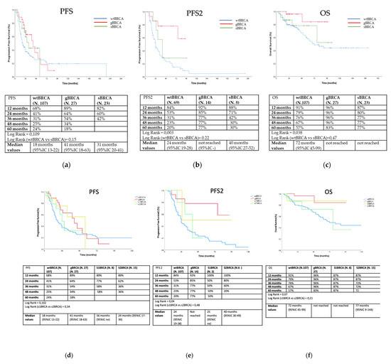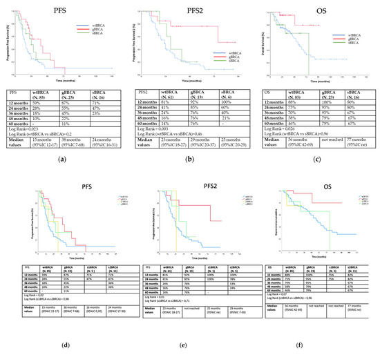 Outcome analyses were conducted with 157 patients since for one patient the data regarding treatment were not available. Overall, after a median follow-up of 45.7 months, the median PFS was observed to be 18 months in wild-type patients, 41 months in gBRCA carriers, and 31 months sBRCA mutation carriers (log rank = 0.109) (Figure 1a). No patient received PARP inhibitors as maintenance after first-line therapy. Median progression-free survival 2 (PFS2) was 24 months in wild-type patients, not obtained in gBRCA carriers, and was 40 months for sBRCA mutation carriers (log rank = 0.003) (Figure 1b). Three sBRCA (12.5%) and six gBRCA (22.2%) mutation carriers received a PARP inhibitor as maintenance after second-line therapy (eight patients received olaparib and one patient niraparib). Median OS was 72 months in wild-type patients, and not obtained in gBRCA carriers and sBRCA mutation carriers (log rank = 0.038) (Figure 1c). sBRCA carriers did not show any advantage in terms of PFS (log rank = 0.15, Figure 1a), PFS2 (log rank = 0.22, Figure 1b), and OS (log rank = 0.47, Figure 1c) as compared to wild-type patients. Finally, PFS, PFS2, and OS did not significantly differ between s1BRCA and s2BRCA patients (log rank = 0.34, Figure 1d; log rank = 0.48, Figure 1e; log rank = 0.21, Figure 1f).