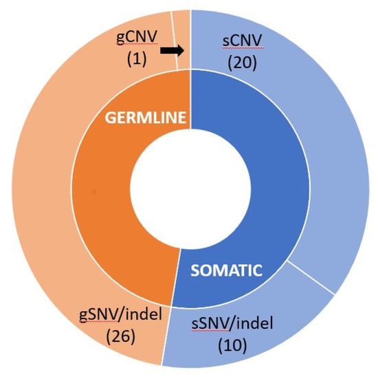 If germline and somatic carriers seemed to be equally represented in BRCA-mutated patients (27 gBRCAs vs. 24 sBRCAs), CNVs seemed to be much more represented in somatic as compared to germline variants (20 sCNVs vs. 1 gCNV). On the other hand, SNVs or indels were more frequently detected as germline variants (26 gSNVs vs. 10 sCNVs), as shown in Figure 3.