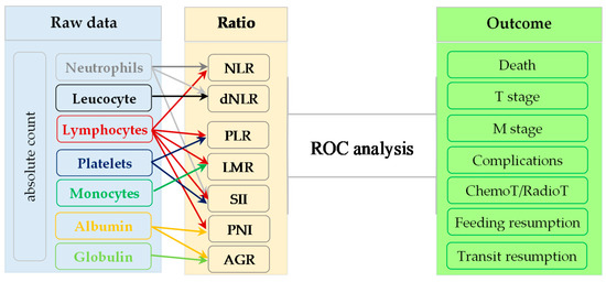 Input data for receiver operating characteristic (ROC) analysis. NLR = neutrophil-to-lymphocyte ratio; dNLR = derived neutrophil-to-lymphocyte ratio; PLR = platelet-to-lymphocyte ratio; LMR = lymphocyte-to-monocyte ratio; AGR = albumin-to-globulin ratio; SII = Systemic Immune Inflammation Index; PNI = Prognostic Nutritional Index. The raw data of three outcomes, namely, T stage, feeding resumption and transit resumption, were used to construct derived dichotomial variables as follows: T1 or T2 vs. T3 or T4 for T stage, resumption of feeding in the first 3 days post-intervention and resumption of transit in the first 4 days post-intervention.