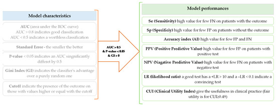 The receiver operating characteristic (ROC) analysis was performed in two steps: (1) model generation and (2) assessment of model performances (Figure 2). The model performance was checked only for those models with an area under the ROC curve (AUC) significantly higher than 0.5 and Gini index greater than 0. Seven indicators were used to evaluate the performances of the classification models. The values of the estimates were accompanied by the associated 95% confidence interval [24]. A classification model was considered clinically relevant whenever the Clinical Utility Index (CUI) proved greater than or equal to 0.49. A +CUI ≥ 0.49 indicates a test with abilities to accurately identify the outcome of interest. The greater the +CUI value, the better the power of ruling in (confirmation). A −CUI ≥ 0.49 indicates a test with abilities in screening; the greater the value, the better the power of ruling out (Figure 2).