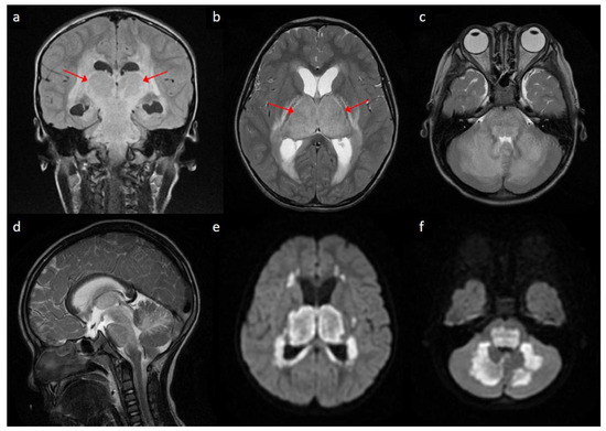 Brain magnetic resonance imaging of the patient: (a) coronal view of T2 fluid-attenuated inversion recovery sequence showing hyperintense signals in bilateral thalami (arrows) and periventricular regions; (b,c) Axial view of T2-weighted sequences at the level of basal ganglia/thalami (arrows) and pons/cerebellum, respectively, showing relatively symmetric hyperintense signals in bilateral thalamic, periventricular, pontine and cerebellar regions; (d) sagittal view of T2-weighted sequence showing hyperintense signal changes in brainstem and cerebellum; (e,f) axial view of diffusion-weighted imaging at the levels corresponding to (b,c), respectively, showing bright signals in bilateral thalamic, periventricular, pontine and cerebellar regions.
