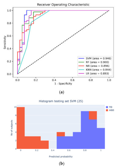 All five ML algorithms achieved overall accuracy of 90%, with the SVM showing the best discriminant validity. The area under the curve in ROC analysis, reported in Figure 2a, confirmed the higher performance of the SVM (95%) with respect to the RF (90%), NB (89%), LR (89%), and KNN (84%) using all features. Furthermore, Figure 2b shows the histogram of the testing set with the results of the best-performing SVM (25).