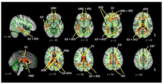 - Park, C.H.; Kim, S.H.; Jung, H.Y. Characteristics of the uncinate fasciculus and cingulum in patients with mild cognitive impairment: Diffusion tensor tractography study. Brain Sci. 2019, 9, 377. [Google Scholar] [CrossRef] [PubMed]